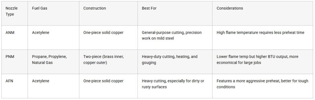 PNM | Propane, Propylene, Natural Gas | Two-piece (brass inner, copper outer) | Heavy-duty cutting, heating, and gouging | Lower flame temp but higher BTU output, more economical for large jobs |